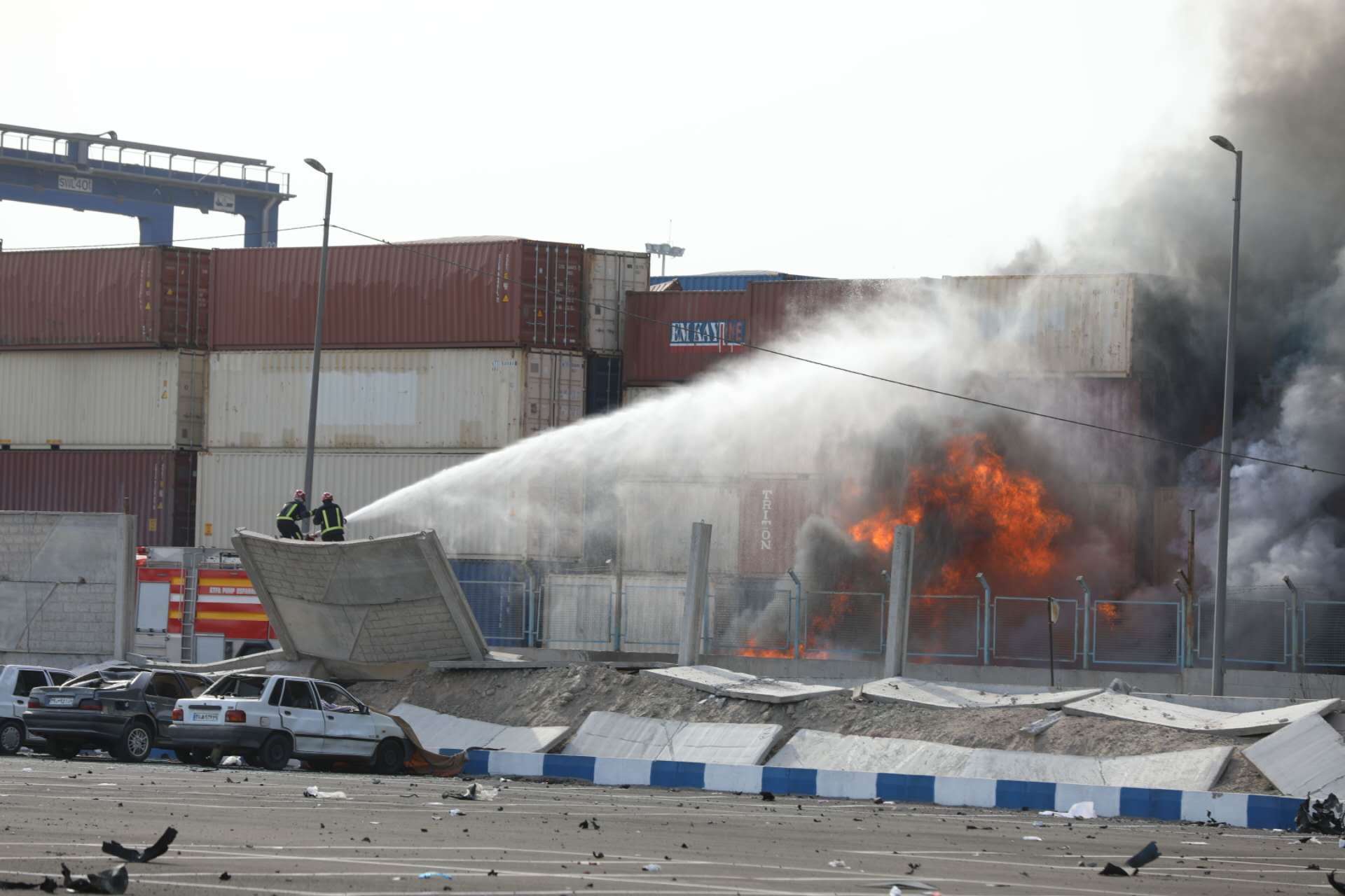 4月26日,救援人员在伊朗南部沙希德拉贾伊港的爆炸现场开展救援工作。新华社发(伊朗迈赫尔媒体集团供图)据伊朗塔斯尼姆通讯社消息,沙希德拉贾伊港的灭火行动已进入最后阶段,火势已经平息。